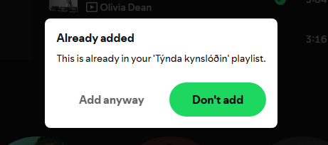 • Pay Attention to Warnings: When you add a song to a playlist, wait a second to see if the green “Already added” pop-up appears. If it does, choose “Don’t add” instead of “Add Anyway.”